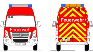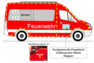 Die Urlaubszeit geht vorbei und auch die Firma Aluca hat die letzten Teile bekommen. Die Auslieferung des Fahrzeugs ist für den kommenden Montag (26.07.) geplant, wir sind gespannt. Bevor das Fahrzeug endgültig in den Einsatzdienst geht, wird es noch für 1-2 Tage zur Beschriftung/Beklebung gehen (siehe schematische Vorlage). |